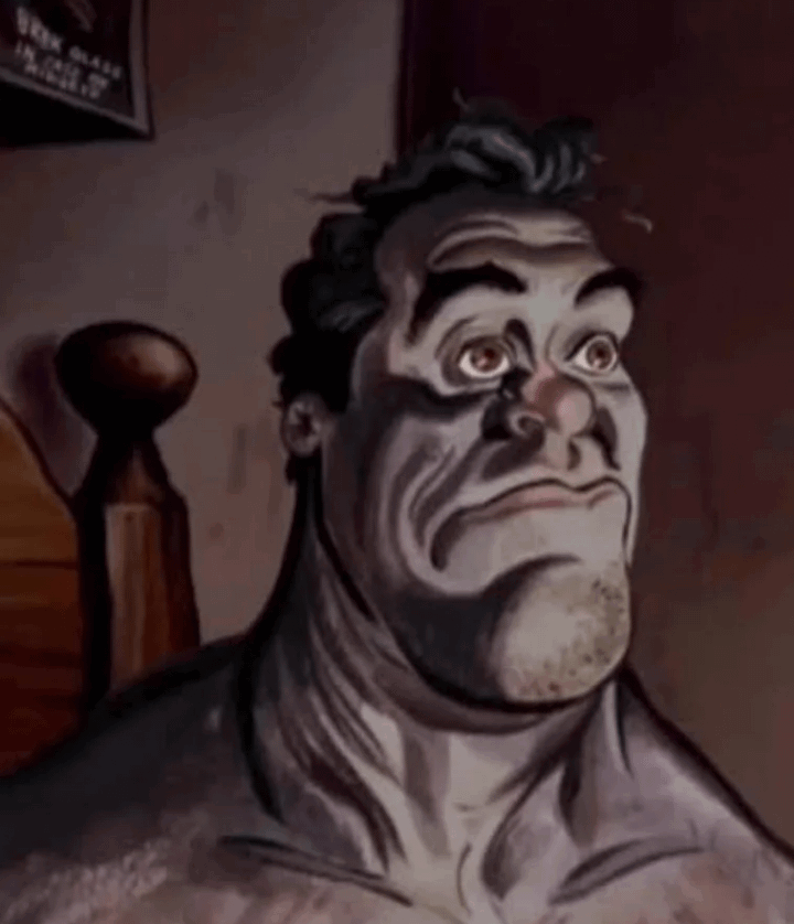 "Вот сидит наш герой в городе ест свой обед и тут в округе на глазах появился мужик и ходит у всех на виду и бахвалится на всю улицу, силён видом и словами он, но по первому же взгляду на него, можно понять что умом он не блещет.