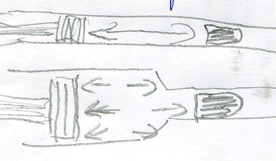 И появляется продольная сила давления на ствол из-за "ступеньки" между калибрами пули и поршня. Теперь сила, действующая на поршень, равна сумме сил, действующих на ствол и пулю (с обратным знаком).