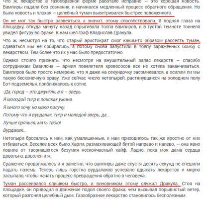 А о том КАК автор передает происходящее я вообще готов оды писать. Она очень точно передала ощущение аниме. Без заумных объяснений, просто от лица человека переживающего эти события. Человека у которого есть свои желания и мотивы. Свои уникальные привычки и умения. Свои пределы. Все происходящее простое и с лёгкой придурью и непонятными внезапными событиями. Пусть это не звучит как комплимент, но это он.