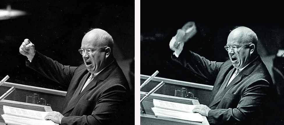 Не я конечно понимаю ,что автор из "булкохрустов" и коммунистов не жалует, но уж откровенное вранье зачем повторять, не стучал Хрущов ботинком на трибуне в ООН.Что это фейк известно уже давно.В Интернете можно увидеть фото, на котором Хрущёв во время выступления машет туфлёй. Это сфальсифицированный снимок. Никто из присутствующих там людей не подтверждает, что Никита Сергеевич стоял перед трибуной и махал ботинком.