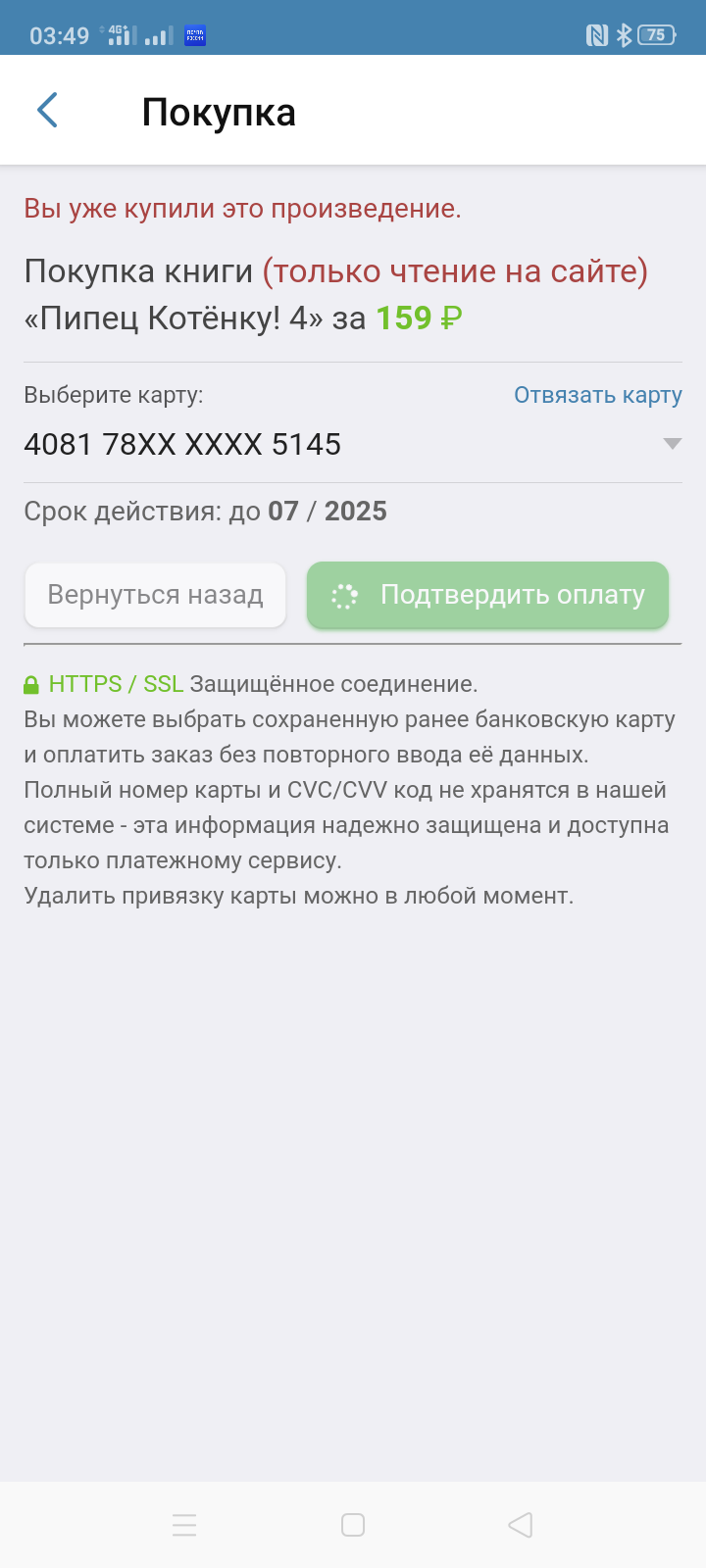 Не понял, что за ерунда!... Оплатил книгу 3 . пытаюсь читать - требует оплатить доступ. Думаю, может, оплата не прошла? Пробую ещё разок оплатить. Пишет:"вы уже купили данное произведение" ...