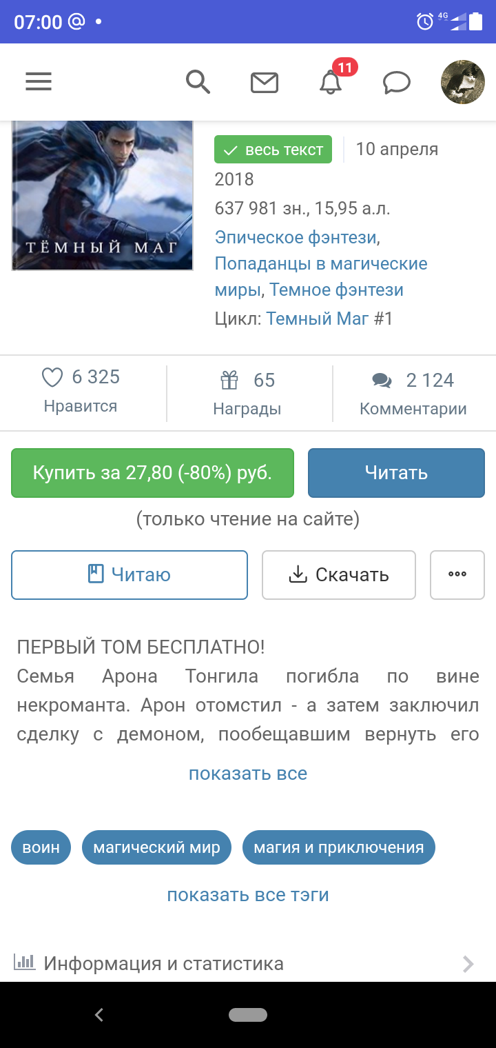 Я очень извиняюсь, ругаться в принципе не люблю. И повторюсь - 28 рублей - не деньги. Но! Во-первых, ещё с утра на главной странице было указано, что ВСЯ книга бесплатна (к сожалению, не сделала скриншот), а сейчас там указана цена. Во-вторых, на других сайтах (например, ЛитРес) в ПЕРВОЙ книге - части, а не тома. И если уважаемый автор приводит книгу к общему знаменателю, его право. Я же говорю о том, что изначально книга была из частей и воспринималась первая книга как первый том. И оферта на сайте была именно такая - первая книга бесплатно. А сейчас она платная, и в других книгах "тома́" не упоминаются. И возникает противоречие, из-за замены автором "частей" на "тома́". У других авторов нет такой "игры слов", все ясно и прозрачно, и никаких заблуждений. Неприятно... Сей опус не требует ответа, автору, конечно, виднее, и автор имеет полное право установить цену на свой труд. Ещё раз - приношу извинения, если кого обидела.