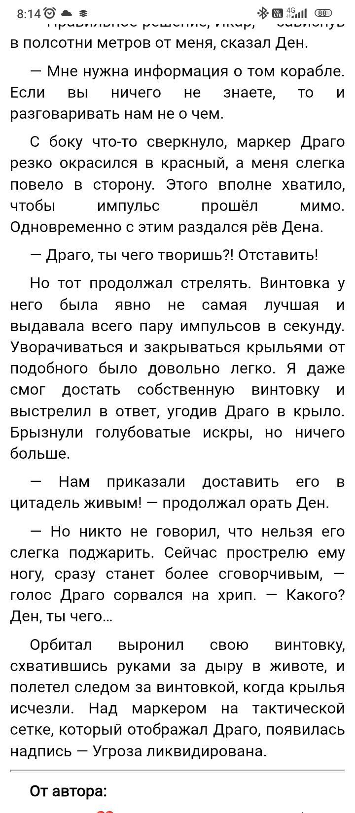 Заметил, что Роман "прислушивается" к мнениям касающиеся малых или незначительных деталях. - Образы новых лордов; Названия кораблей или новых типов демонов (в частности тех, которые не существуют в мире D&D) ; использования отдельных групп воинов, как группировки вдв или спец-отрядов и других подобных идей. А вот идеи и мысли о том скем дружить и с кем воевать... Какую политику проводить на своём слое и как вести дела в целом... Роман и сам без нас разберётся и хватит ему указывать 😉. Прошу прощения, но малость просто накипело. Я понимаю, что возможность оставлять комментарии под произведением для этого и существует, чтобы Мы делились мнением и рассуждали между собой все плюсы и минусы того или иного отрывка произведения. Но... Некоторые комменты и правда "звучат" так, что мол "-Мы не будем так делать. Мы не будем отдавать источник. Мы не будем. Мы не будем. Мы будем..."  И ладно если бы такие комменты писал сам автор, но ведь пишут читаки.