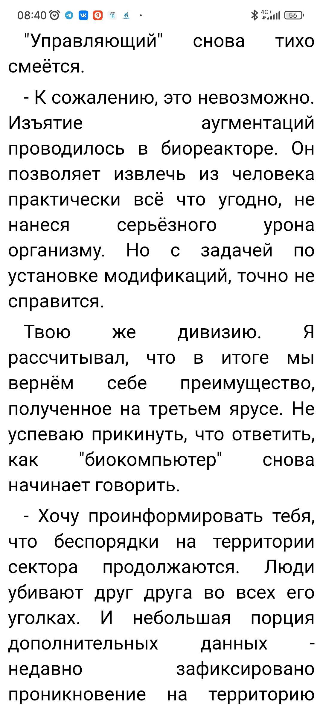 Что то нудно, тягостно и однообразно. Наверное первый цикл который брошу читать.  Тягостно и не интересно. И герой так себе. Первый том был многообещающий, но этот цикл явно слабей Отмороженного. Повествование больно монотонное, несобранное и пёстрое. Герой не интересен. Ноль эмоций.