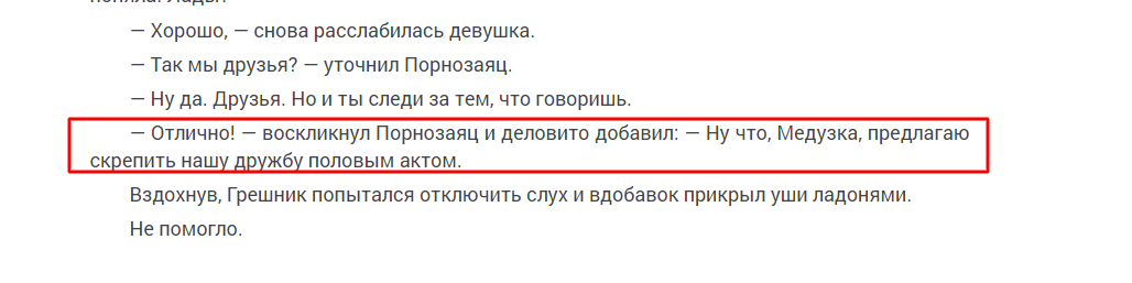 Андрей, ну зачем так слабо?) В восторге... Читатели в ЭКСТАЗЕ от этой сцены! Я, спустя годы, с нежностью вспоминаю этот момент книги, и он неизменно дарит мне искреннюю улыбку ))