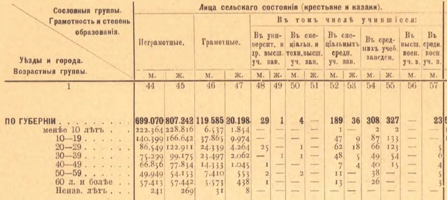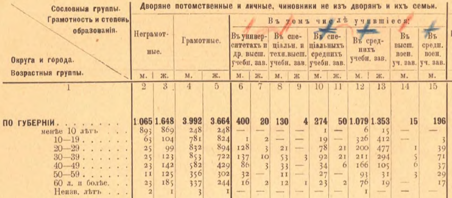 На примерно 10000 дворян неграмотных старше 10 лет - не более 10% в самых неграмотных возрастных группах. Из примерно 5000 мужчин 400 имеют высшее образование и еще 130 - высшее специальное. 1079 мужчин и 1350 женщин учились в средних и еще 274 и 50 (м+ж) средних специальных учебных заведениях. Это не считая военных.