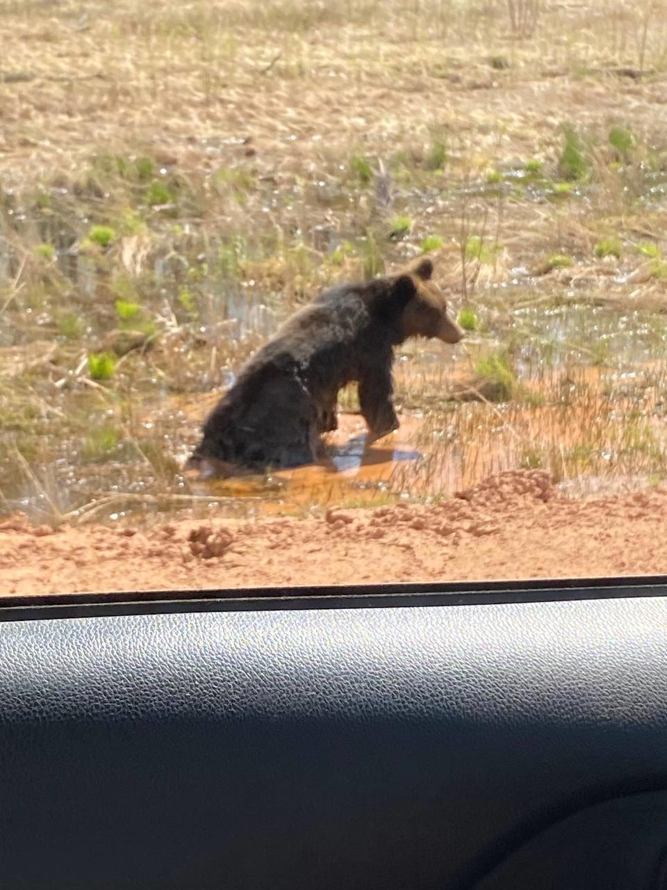 Местные обитали и погодные условия, при этом мишка ещё сонные. так то они у них шарятся порой по территории только в путь.