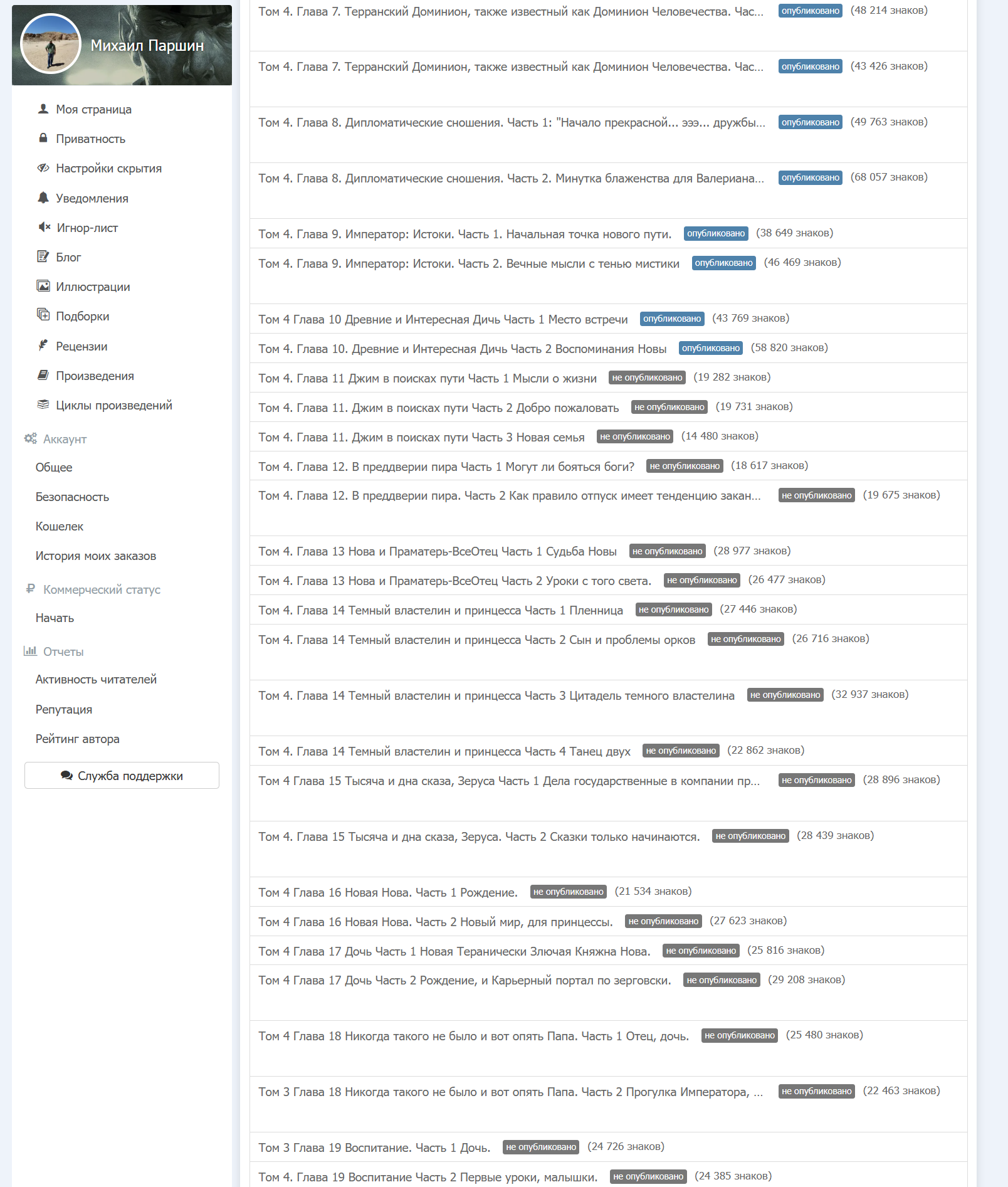 В-четвёртых, вопрос времени, работы над книгой и наша якобы «лень». Мы все — взрослые люди. У нас, у Дениса и у меня (Михаила), помимо этого безвозмездного — подчёркиваю! — творчества для наших дорогих читателей, хватает забот и в реальной жизни. Мы не гонимся за лайками, хайпом или сиюминутной славой. Если вы посмотрите на статистику и сравните «общую температуру по больнице», то заметите разительные отличия: и в объёме глав, и в скорости их выхода, и в широте охвата сюжета. Мы смеем надеяться, что этими параметрами выгодно отличаемся от многих коллег, которые рубят деньги здесь и сейчас. Не скрою, мы размышляли о коммерциализации проекта, но сознательно отказались от этой идеи… по крайней мере, пока. Ведь такой статус вынудил бы нас писать быстрее, халтурнее и, что самое главное, без души. Как вы сами верно подметили, не всей аудитории пришёлся по душе первый отход от первоначального формата истории и характеристик главного героя, но таковы были требования реалий жизни и логики развития сюжета. К тому же, когда Денис только начинал писать серию, его идею попросту позаимствовал один товарищ, с которым мы спорим до сих пор, а другой попросил разрешения адаптировать её под себя, на что Денис тогда согласился.