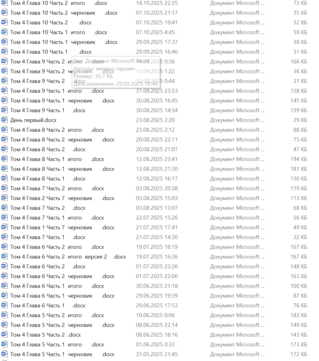 Для наглядности я вам покажу тот же 4-й том, который сейчас как раз находится в активной стадии редактуры, переписывания и правок. В среднем, каждая глава проходит через три, как минимум, полноценных этапа переработки. А что такое «переписывать» на практике? Сначала ты вычитываешь черновой вариант, затем вносишь сюжетные дополнения или масштабные изменения, потом тщательно соотносишь их со всей предыдущей канвой, согласование и только после этого начинается финальная, чистовая редактура. И на каждый такой цикл в среднем уходит от 10 до 16 часов кропотливого труда. То есть — это писец как долго.