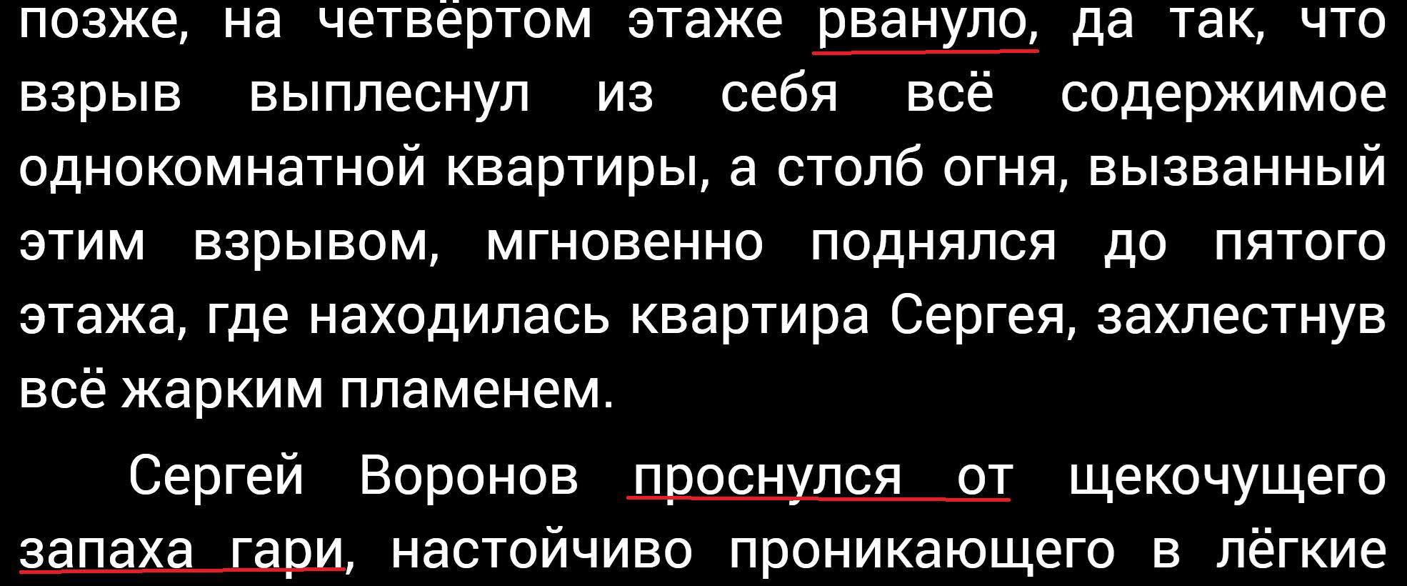 то есть ВЗРЫВ ГГ не разбудил. Взрыв который выбил стекла в его квартире. Ок огонь снизу поджег занавески его квартире, но КАК могли загореться ВСЕ двери сразу...