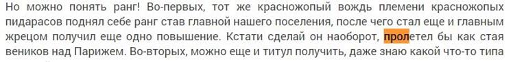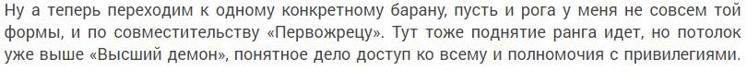 К слову мог бы сразу указать, процитировать и подчеркнуть, указать, что идет отсылка на какой абзац, а не прочти заново. Видишь же, что люди читают и почему-то воспринимают по другому. Сложно что ли? Потому что читал и автор разнес инфу по разным абзацам, хотя мог в одно предложение вместить, вместо "тут тоже поднятие ранга идет, но потолок уже выше высший демон" писать сразу "тут тоже поднятие ранга идет на ступень как у главного жреца, но потолок ранга выше и это высший демон". Забыв отсылку к другому абзацу его текст воспринимается как поднятие сразу до высшего.