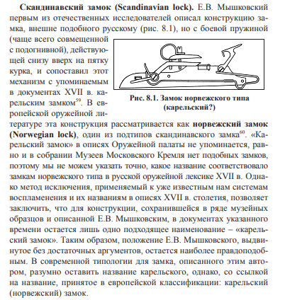 Об использовании кремневых замков на огнестрельном оружии в России в начале XVII в. и возможно ранее в первую очередь говорит копанина: ружейные кремни времен Смуты были найдены в Ладожской крепости (П. А. Миляев Предметы вооружения XVI–XVII вв. из раскопок на территории ладожского посад), так же найдены кремневые замки на месте Тушинского лагеря (раскопки вел Двуреченский https://archaeolog.ru/el-bib/el-cat/el-books/el-books-2018/tushino). Один из них четко опознан как карельский, он же скандинавский замок: