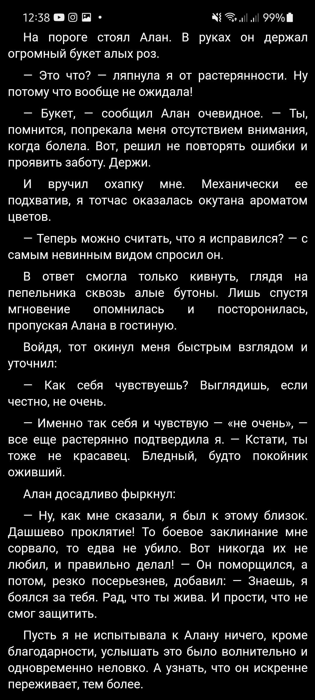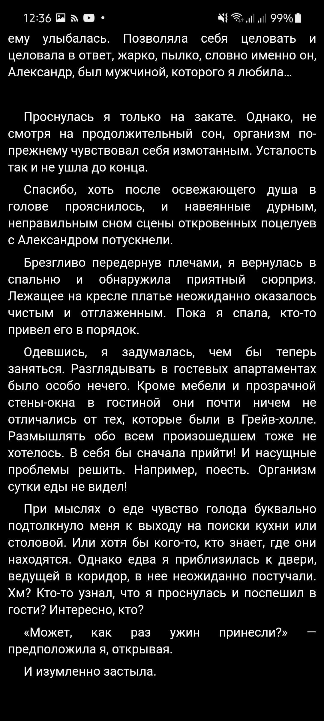 Все пишут, что Александр удивил своим поступком, а мне, напротив, он кажется обоснованным и логичным. Сначала Ева была лишь его целью, которой Александр должен был проникнуться, чтобы держать под контролем. Но в конечном итоге это всё перешло на более глубокий уровень, и у него появились к ней чувства. Да, его любовь не в общепринятом значение слова, со своими сложностями, но, думаю, это всё была любовь. Или, по крайней мере, начавшая зарождаться любовь. И его поступок в последней главе лично у меня только подтвердил подобные мысли.