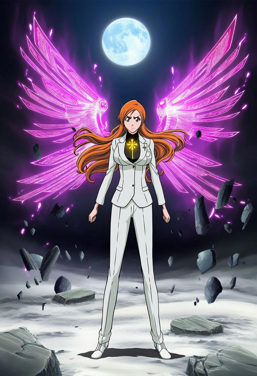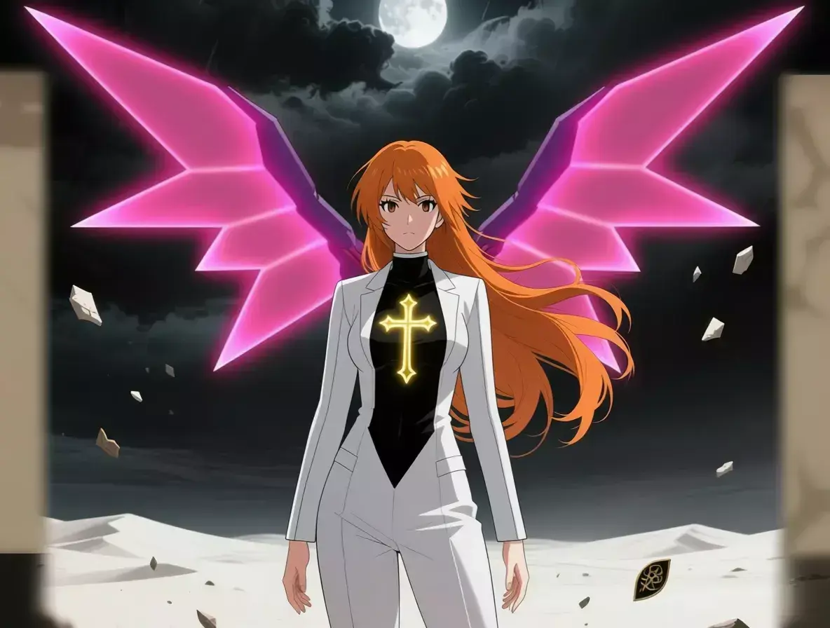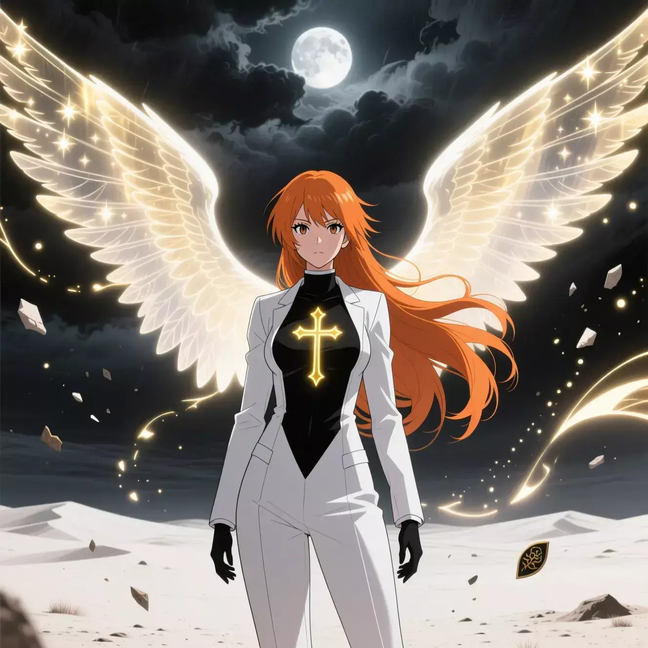 Orihime Inoue from Bleach style, standing confidently with long flowing orange hair, wearing a white suit with a black undershirt and golden cross symbol. Behind her are massive angelic wings like Sanguinius — radiant, glowing, and ethereal, spreading wide with divine energy. She stands in Hueco Mundo, with a desolate white desert under a dark sky and the moon above. The atmosphere feels mystical and powerful, filled with spiritual energy. Drawn in detailed anime style inspired by Bleach (Tite Kubo’s art), with strong lighting, sharp lines, and dramatic composition.
