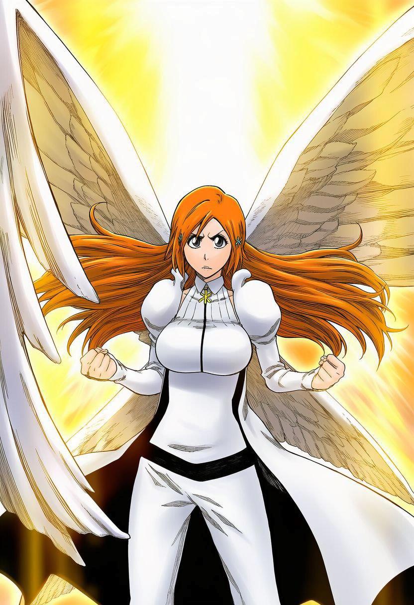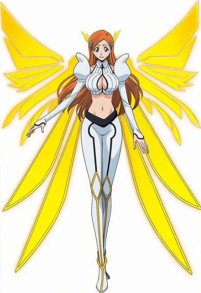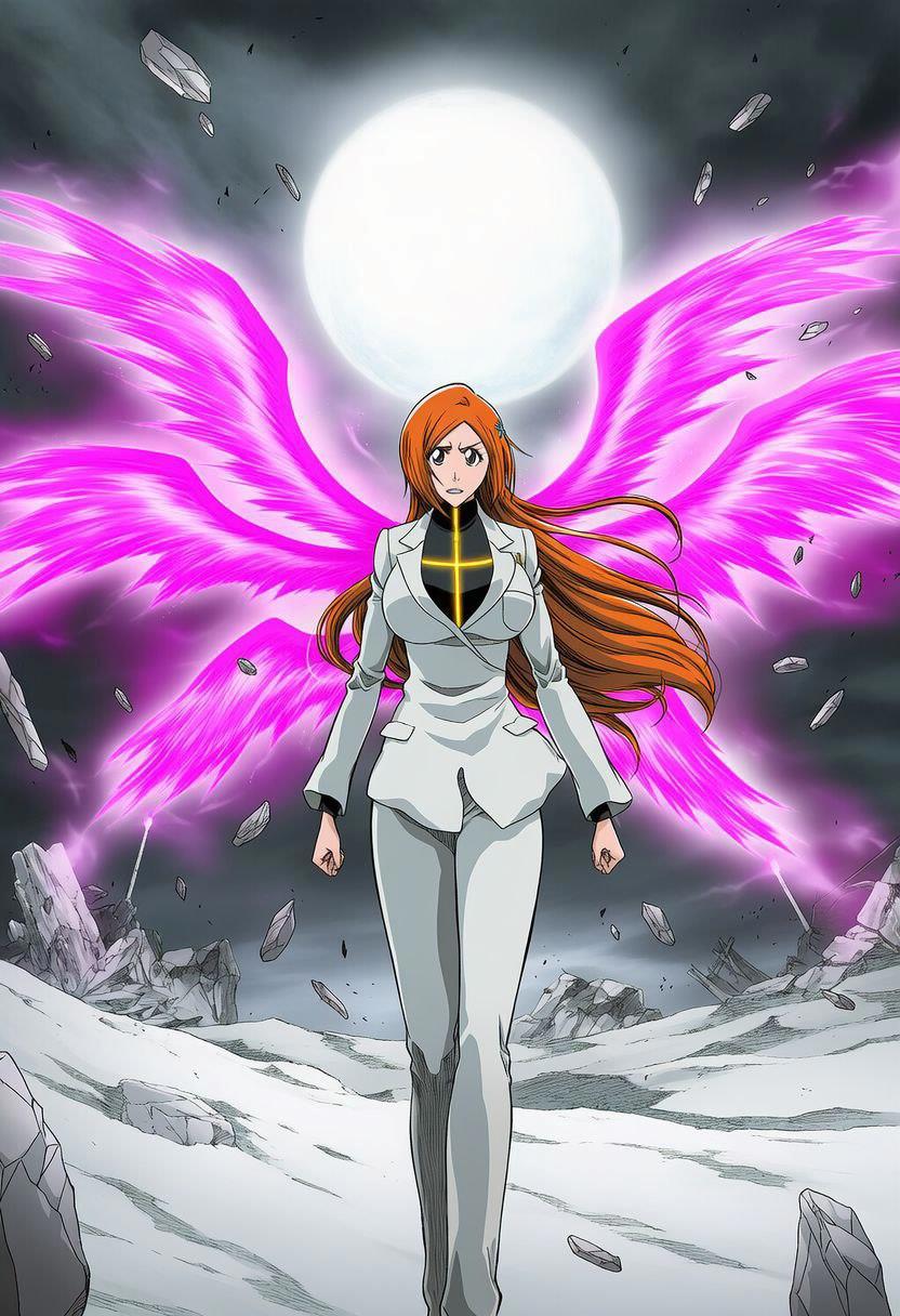 Orihime Inoue from Bleach style, standing confidently with long flowing orange hair, wearing a white suit with a black undershirt and golden cross symbol. Behind her are massive angelic wings like Sanguinius — radiant, glowing, and ethereal, spreading wide with divine energy. She stands in Hueco Mundo, with a desolate white desert under a dark sky and the moon above. The atmosphere feels mystical and powerful, filled with spiritual energy. Drawn in detailed anime style inspired by Bleach (Tite Kubo’s art), with strong lighting, sharp lines, and dramatic composition.