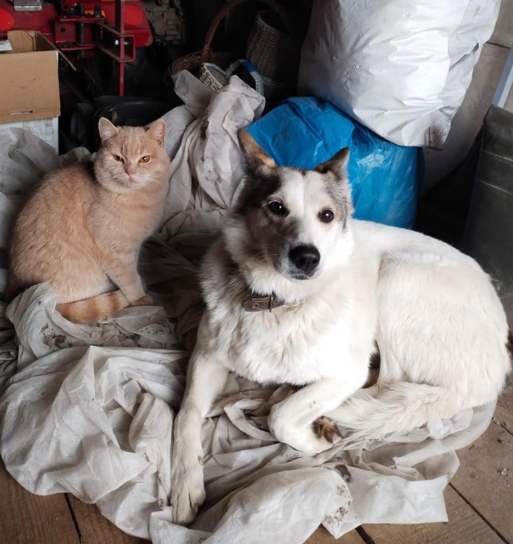 Кота ещё маленьким дети принесли, может потому собака его и приняла. Она его даже мышей ловить учила! И кот пойманную мышь не людям приносит показать, а собаке приносит! А когда соседские коты приходят подраться, то Персик коварно подводит их к Белке, а потом вместе преследуют удирающего.