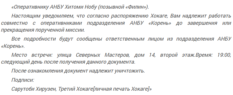 СЕРЬЕЗНО!!!! Имя Нобу, то что он является АНБУ и его позывной в одном предложении!!!! В приказе, который несли через всю страну огня, захваченную территорию и прифронтовую зону... И это при живом то Данзо!!! На данный момент Нобу если еще не стратегическое оружие деревни, то с учетом возраста и уже показанных талантов, имеет все шансы стать таковым в ближайшие годы. Что и Данзо и Хирузен понимают. Если я правильно помню, в более ранных главах было, что Хирузен даже поручил полиции следить за тем, что бы вражеская разведка не узнала имя призрака. Несколько раз повторялось, в том числе и в этой арке, что Официально Нобу коноху не покидал и точно не связан ни с какими АНБУ. По идее, о том кто такой Филин и что именно он является тем самым призраком, должны знать исключительно малое количество людей. Хирузен, Данзо, глава клана Учиха (как глава полиции) и куратор АНБУ (+сокомандники АНБУ). Даже другие старейшины не должны знать кто скрывается за маской филина, как и другие главы кланов.