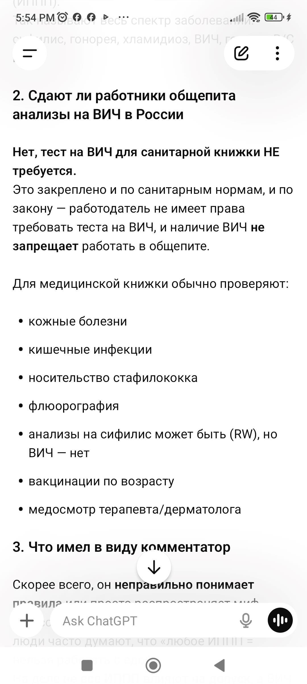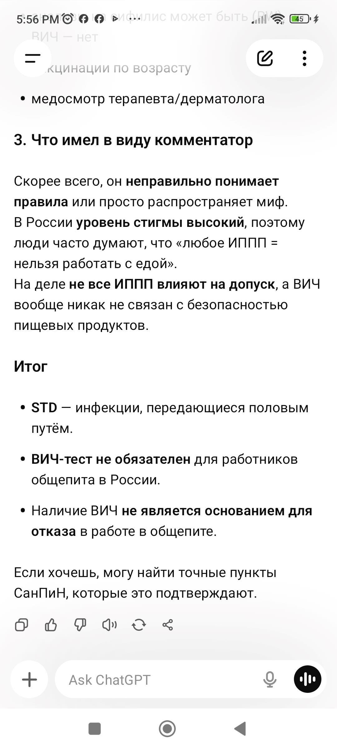 Я не понял момент с ВИЧ. В чем проблема работать с ВИЧ в общепите? Он же так не передается. Какие-то предрассудки, когда хотелось бы наоборот просвещения.