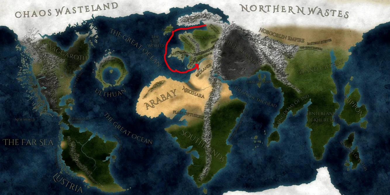 Вот примерная суть ГЕНИАЛЬНОГО маневра Тамурхана, при этом до того, он в пустошах хаоса за гномскими горами тусовался (на севере той черной местности на карте)