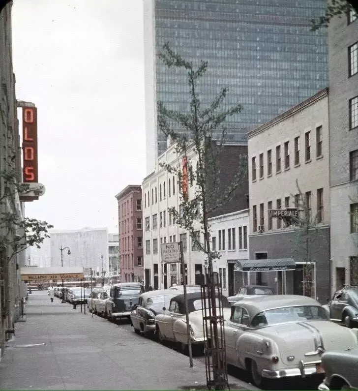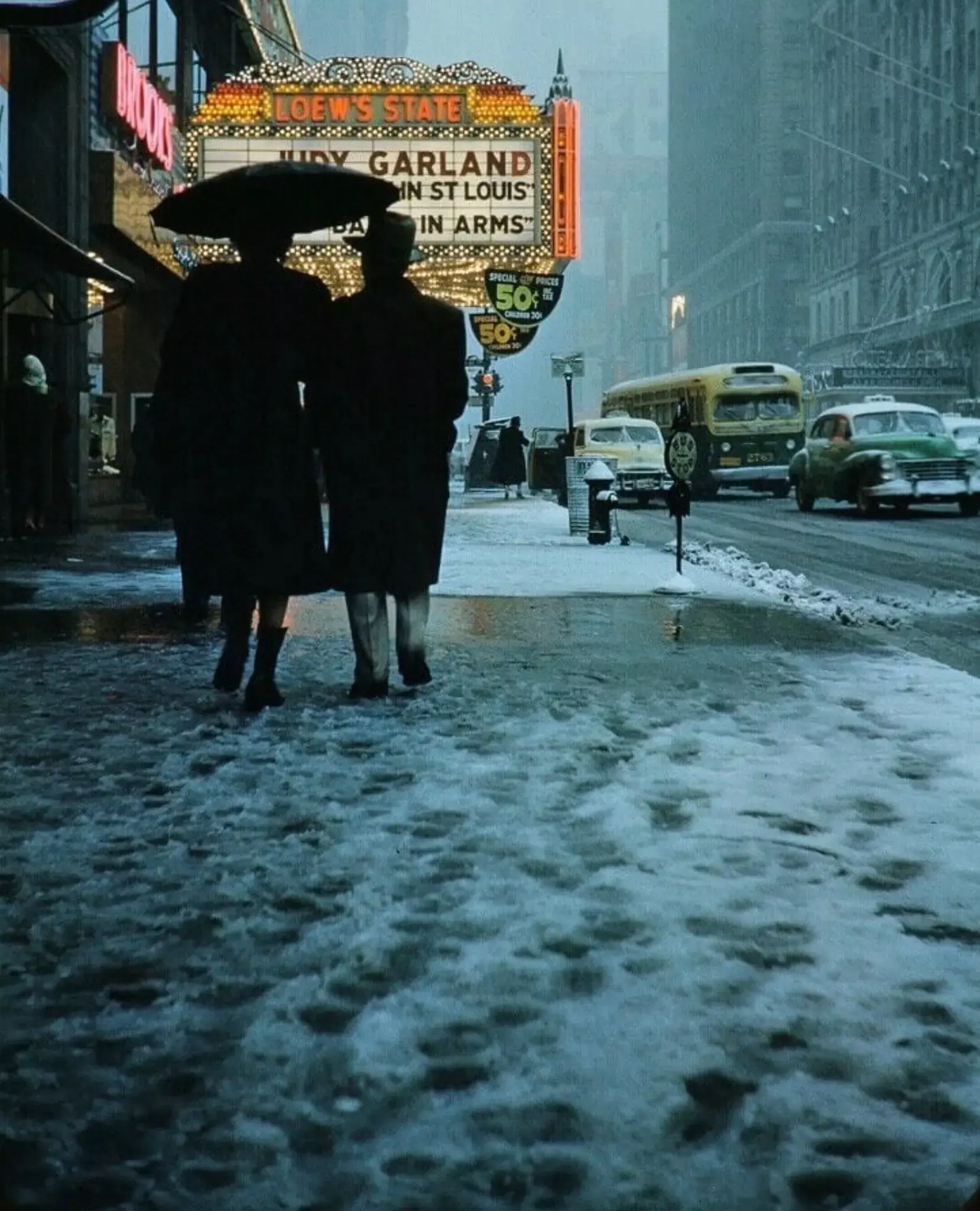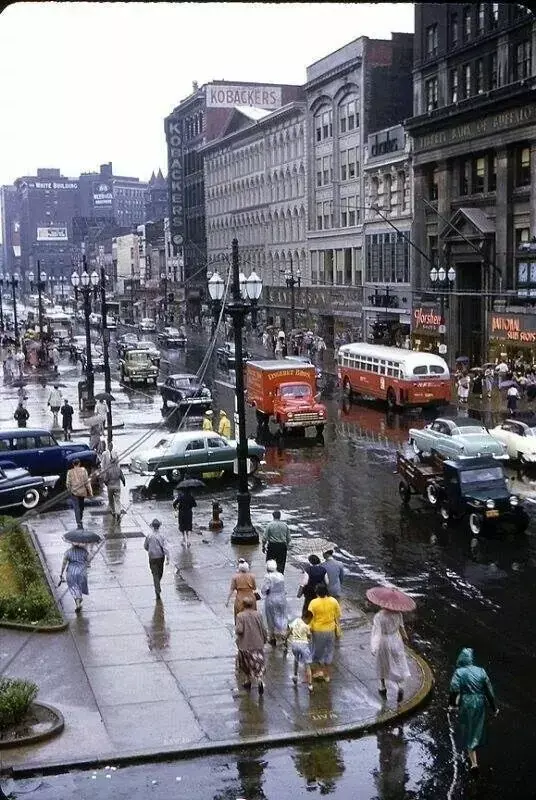 Удивительное качество фотографии! Как будто только что я сам там оказался, там, в 1951 году на этой самой улице. Серьезно, от этой фотокарточки веет холодом той погоды на улице. И такая слякоть! Все ботинки промокли! Такой реальный, настоящий вид на город.