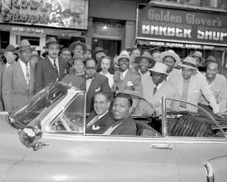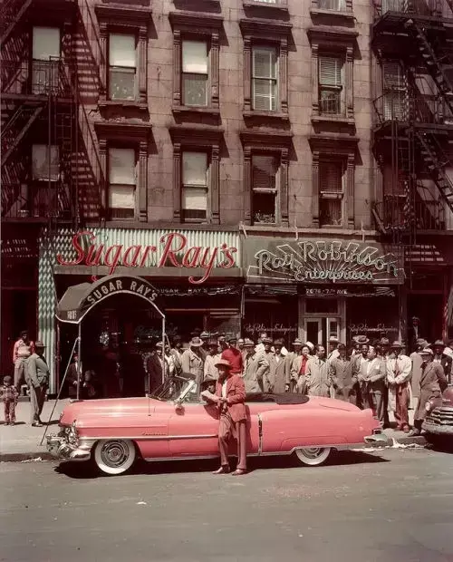 Боксер Шугар Рэй Робинсон позировал перед своим новым розовым кабриолетом Cadillac напротив своего заведения «Ray Robinson Enterprises» в Гарлеме, Нью-Йорк, 1950-е.