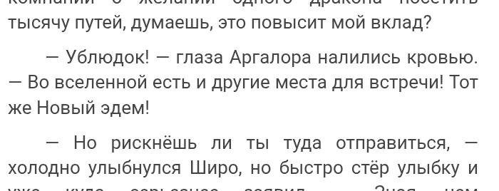 А именно, то что дриарка говорит с капитаном на одном языке. Если с орками это можно объяснить, что расы контактировали достаточное долгое время, куча лет прошло, то единственное что приходит на ум в попытке хоть как-то объяснить практически мгновенное взаимопонимание дриара и человека, то это то, что они родом из космоса. Правда одно но, они очень долго не контактировали, сколько там, лет 300? (Перечитал где-то в районе 350 лет). А значит языки так или иначе должны были сильно изменится у обоих сторон (т.е. у одной стороны изменение идёт в одну сторону, у другой в другую), плюс добавляются новые слова в обиход. Просто это достаточно сильный и интересный момент, и я думал, а как они будут понимать друг друга, что придумает автор? А они раз, и понимают друг друга, а? Что? Как? Почему? (Ну и чисто для интереса посмотрел как выглядела письменность лет 300 назад, если коротко, мне ничего не понять из этого вороха символов. Ну и дополнительно расшифровку к этой письменности, часть понятно, но часть вообще не понятно что за слова и куда их, как мне их понимать, не совсем понятно.