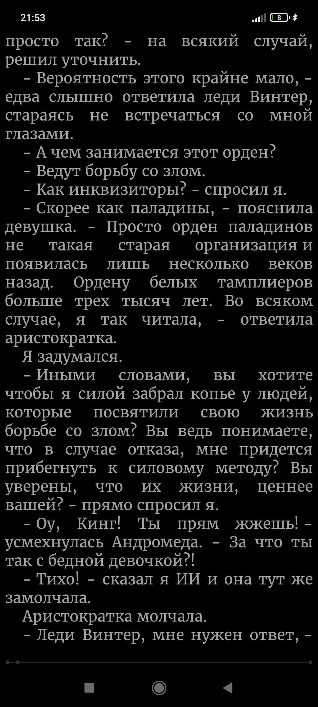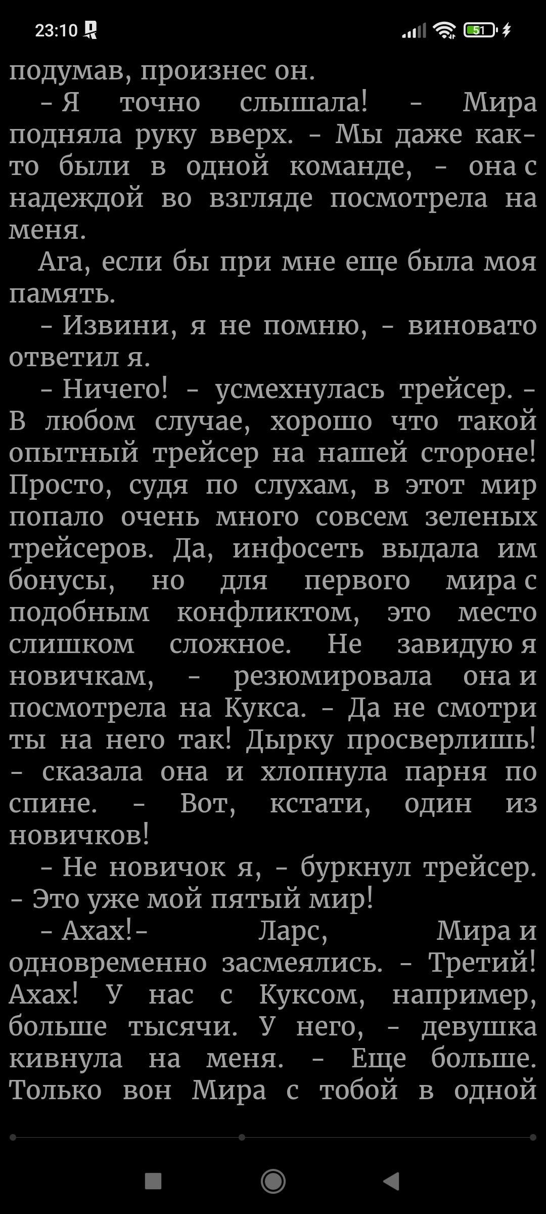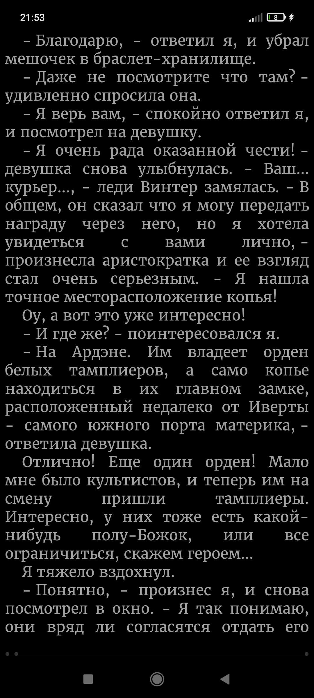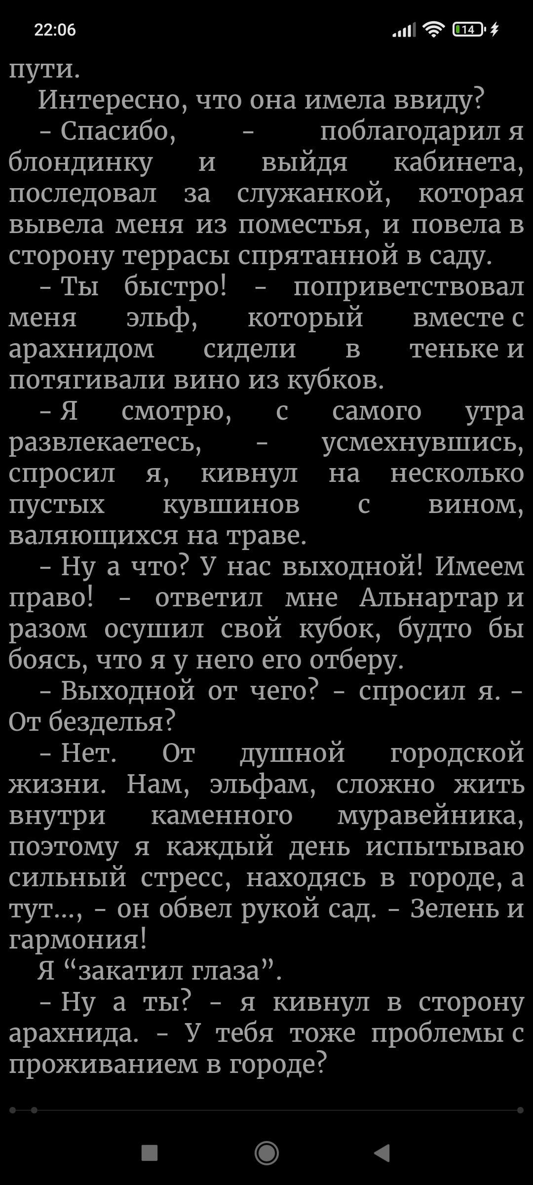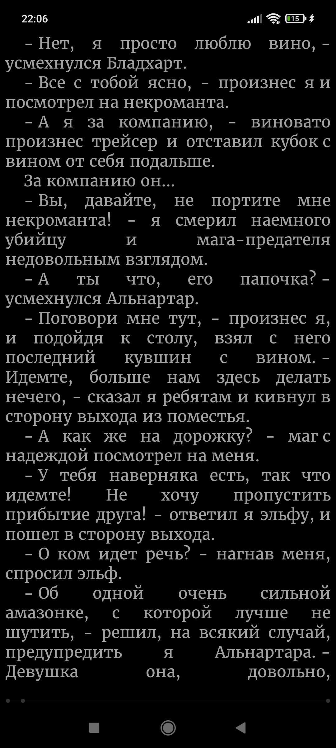 Я выхода новой главы жду больше чем зарплату... Никогда больше не начну читать книгу пока она не будет написана до конца.... Но за продолжение спасибо, больше, вообще не понимаю почему на ваших книгах так мало лайков, они же просто офигительные!