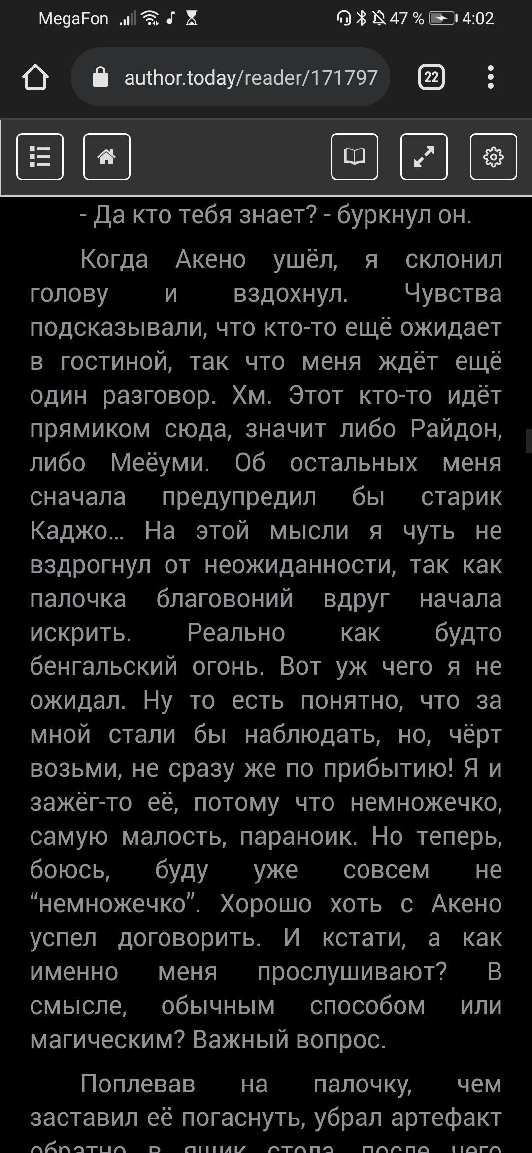 Читая я честно немного не поняла. В прошлой книге Анна выжигала пятно тьмы с плеча Артура, и ей помогала в этом Анастасия. Но при этом в 4 главе чётко сказано что Анастасия не знала то что он одержимы, хотя это пятно именно из-за этого и появилось. Либо это я запуталась и не поняла, либо это достаточно большой ляп автора