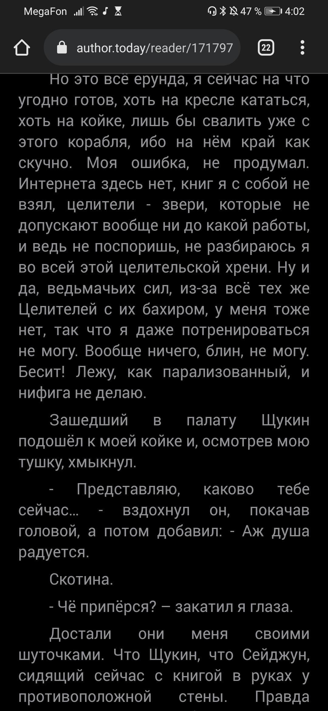 Книга интересная и понравилась, только есть одно но. Разделите по отдельным главам её. 1 главой не удобно, при обновлении страницы пока читаешь главу 8 к примеру, страница возвращается к началу 1 главы