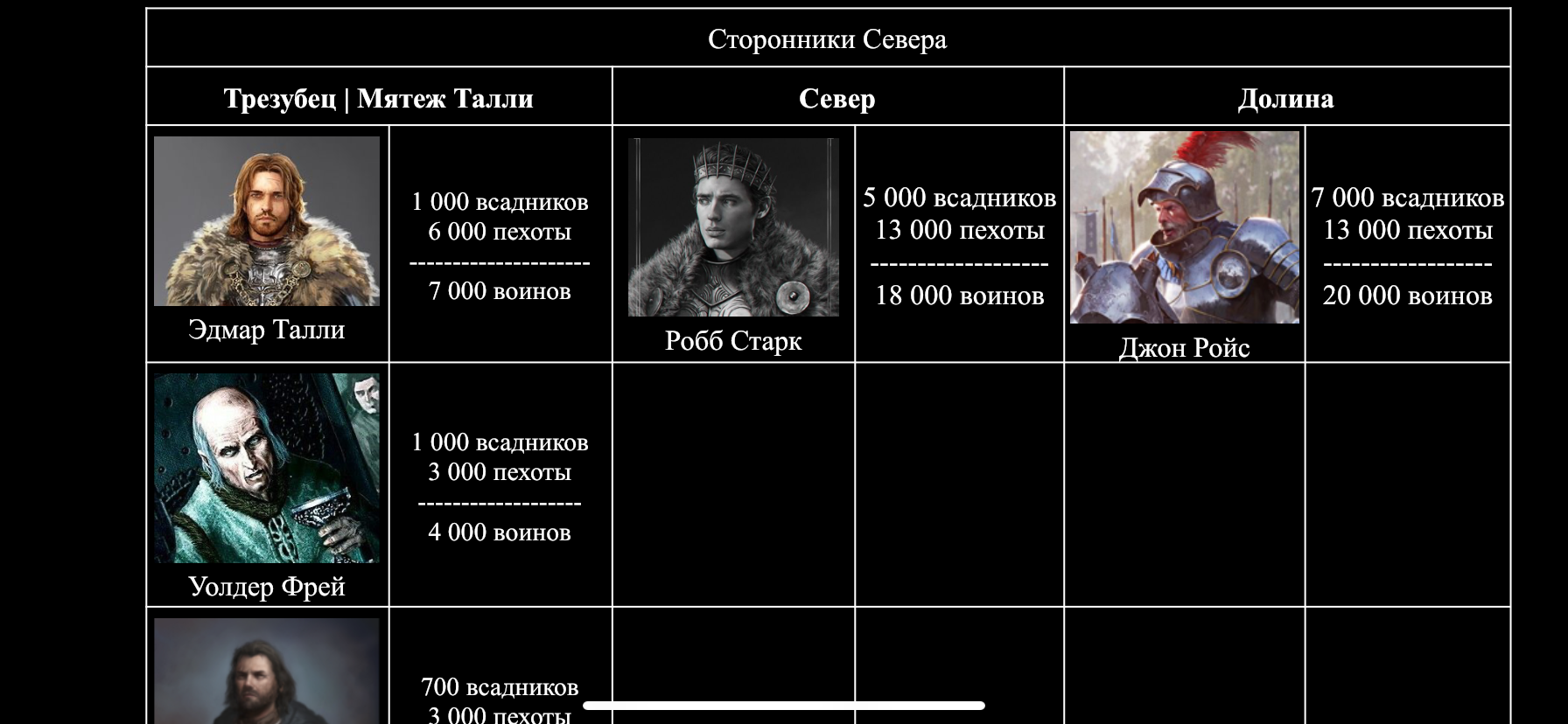 На севере есть только у Мандерли, аля «Рыцари Белой Гавани». Ну и Мормонт.