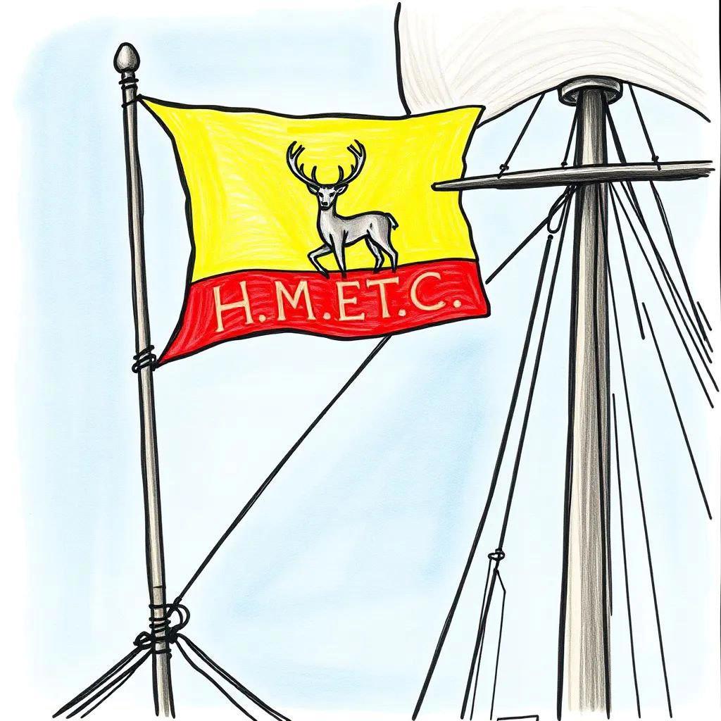 Штандарт на корабле Королевской Восточной Торговой Компании. Внизу — аббревиатура «H.M.E.T.C.» (His Majesty's Eastern Trade Company).![]()