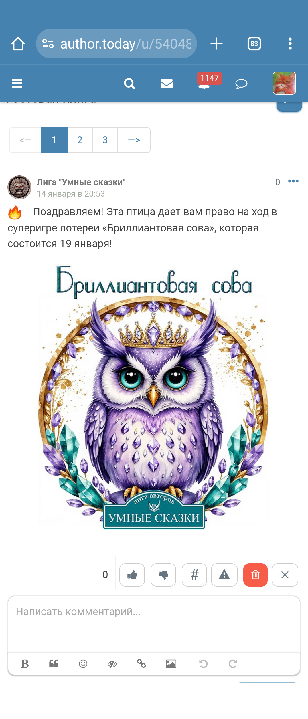 Написалa комментарий к посту Лотерея "Бриллиантовая сова 2026" начинается!