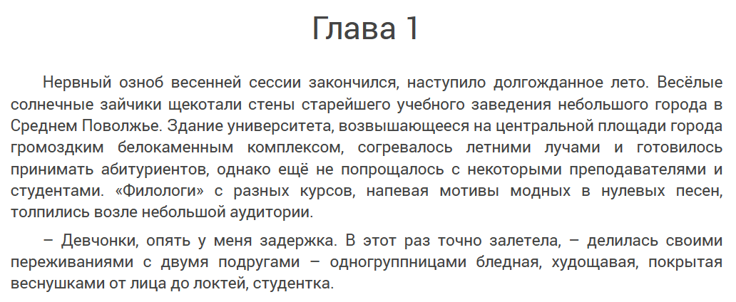 Что можно сказать сразу, стиль тяжеловесный. Пассаж «старейшее учебное заведение небольшого городка в Среднем Поволжье» напоминает скорее газетную статью и совершенно не гармонирует с игривыми «весёлыми солнечными зайчиками». Ну и информация эта совершенно лишняя, по крайней мере, в первом же абзаце романа.