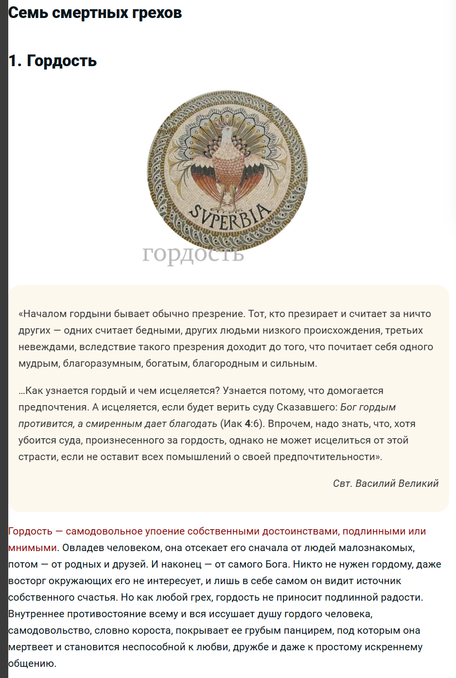 Ну, вообще-то, гордость — гордыня , как она обычно называется в текстах, ассоциирующихся со словом «аминь» — это один из сими смертных грехов. Как учит нас писание, всё, что есть у человека, всё, чего он достиг, даётся ему богом. Человеческой заслуги здесь нет никакой.