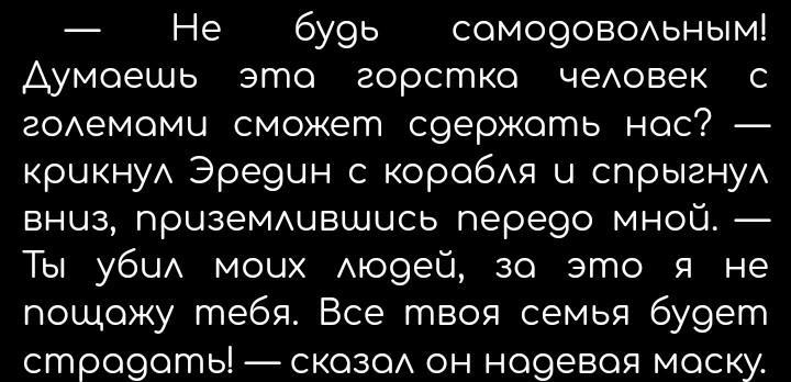 То есть его маги-портальщики убивают людей тысячами и ни че , а как артурчик прикончил парочку , то все - кровная вражда на следующую тысячу лет . Логика конечно нормальная , я бы сам , если хотел доебаться с нихуя , такие предъявы кидал . Но как по мне , проще было написать : "ах ты обоссаный вонючий раб , какого хера ты не в хлеву , Тоби пизда" , ну или " ты убил моих подчинённых , тикай с городу , абрыган !" , Но это на крайняк