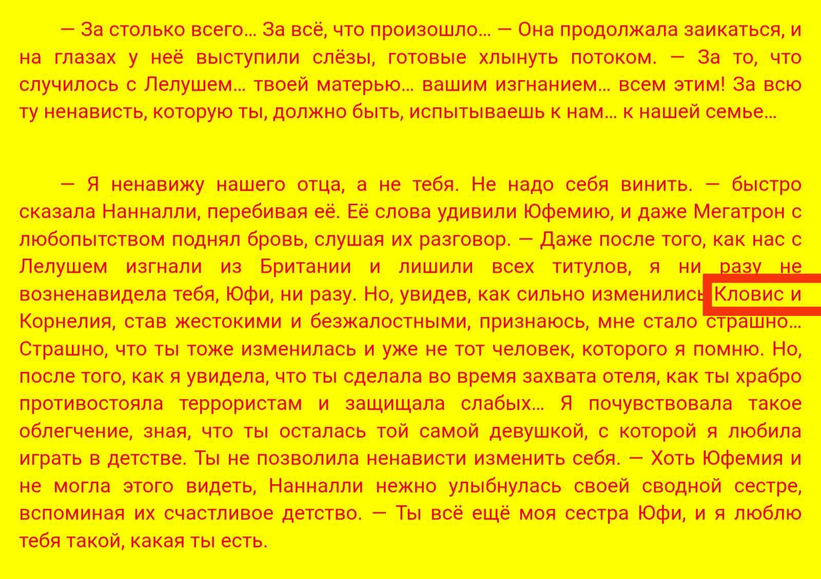 По поводу Кловиса при разговоре Юфемии и Нанналли, но по сути он не жестокий человек, а творческий, так как художник и писал неплохие портреты, но тот по воле судьбы был виновен в гибели многих японцев, но Марианну не убивал и ничего плохого против главной героини Нанналли не имел и был искренне обрадован, то что его единокровная сестра жива, так что если бы не конфликт Нанналли с отцом из-за убийства матери и изгнание с братом в Японию Кловис скорее всего остался бы жив
