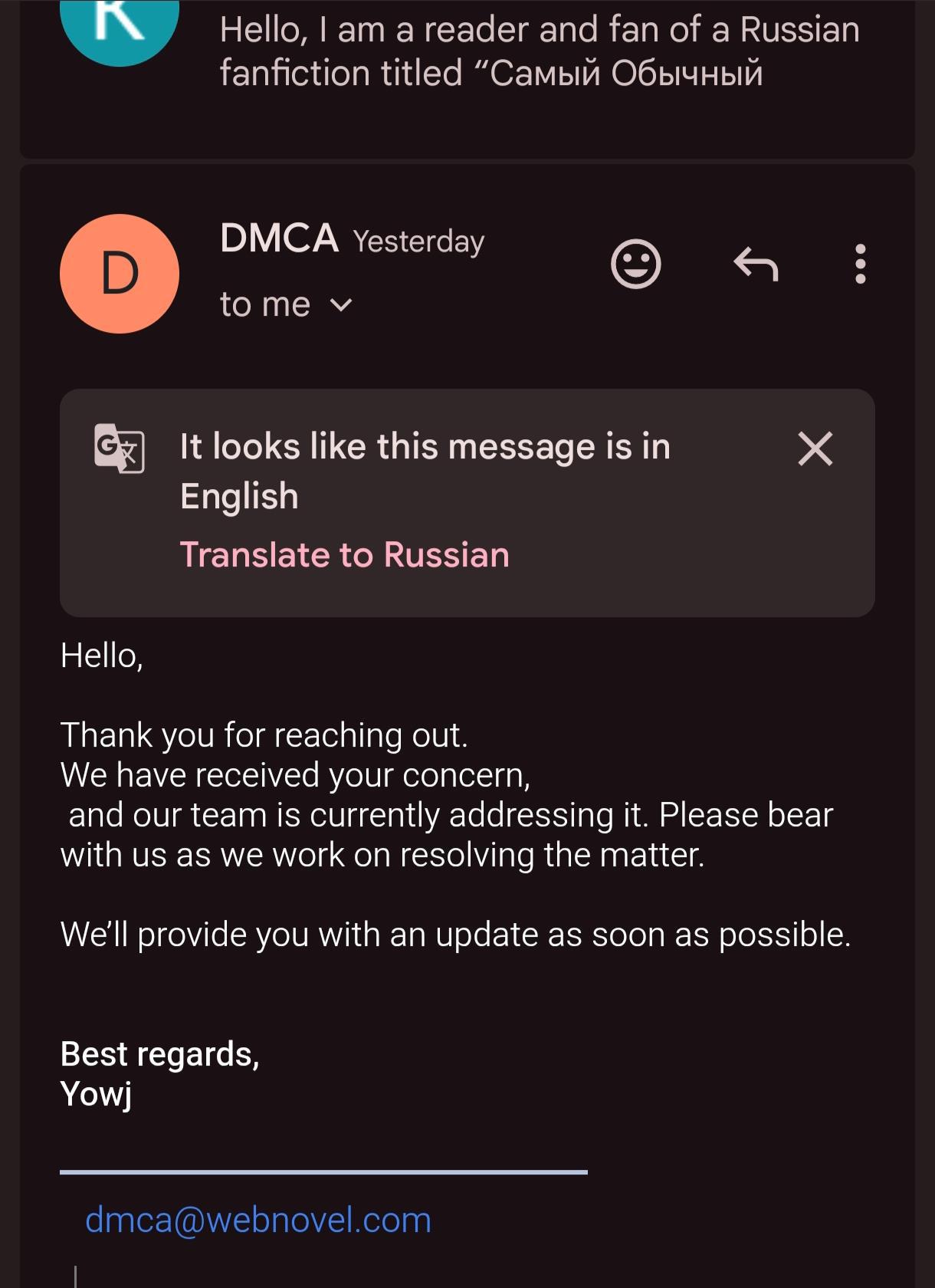 У сайта есть специальный имейл для нарушения авторских прав. dmca@webnovel.com или copyright@webnovel.com.