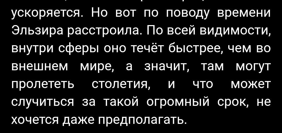 Когда общался с эльфийкой, он пришел к выводам, что время внутри хроносферы течет быстрее, чем снаружи (я это понимаю примерно так: день снаружи = неделя внутри, утрированно)