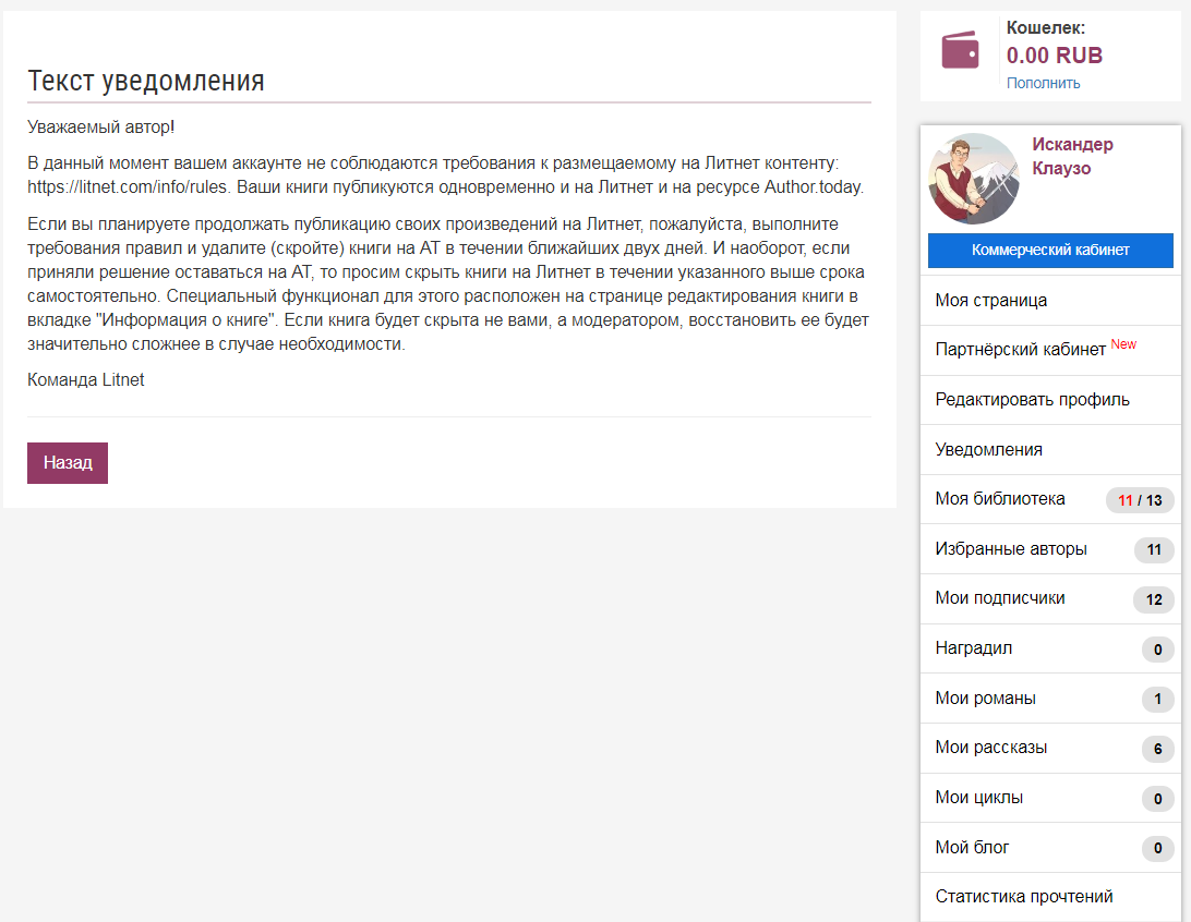 Я не админ и могу показать даже скрин уведомления меня на сайте ЛитНет