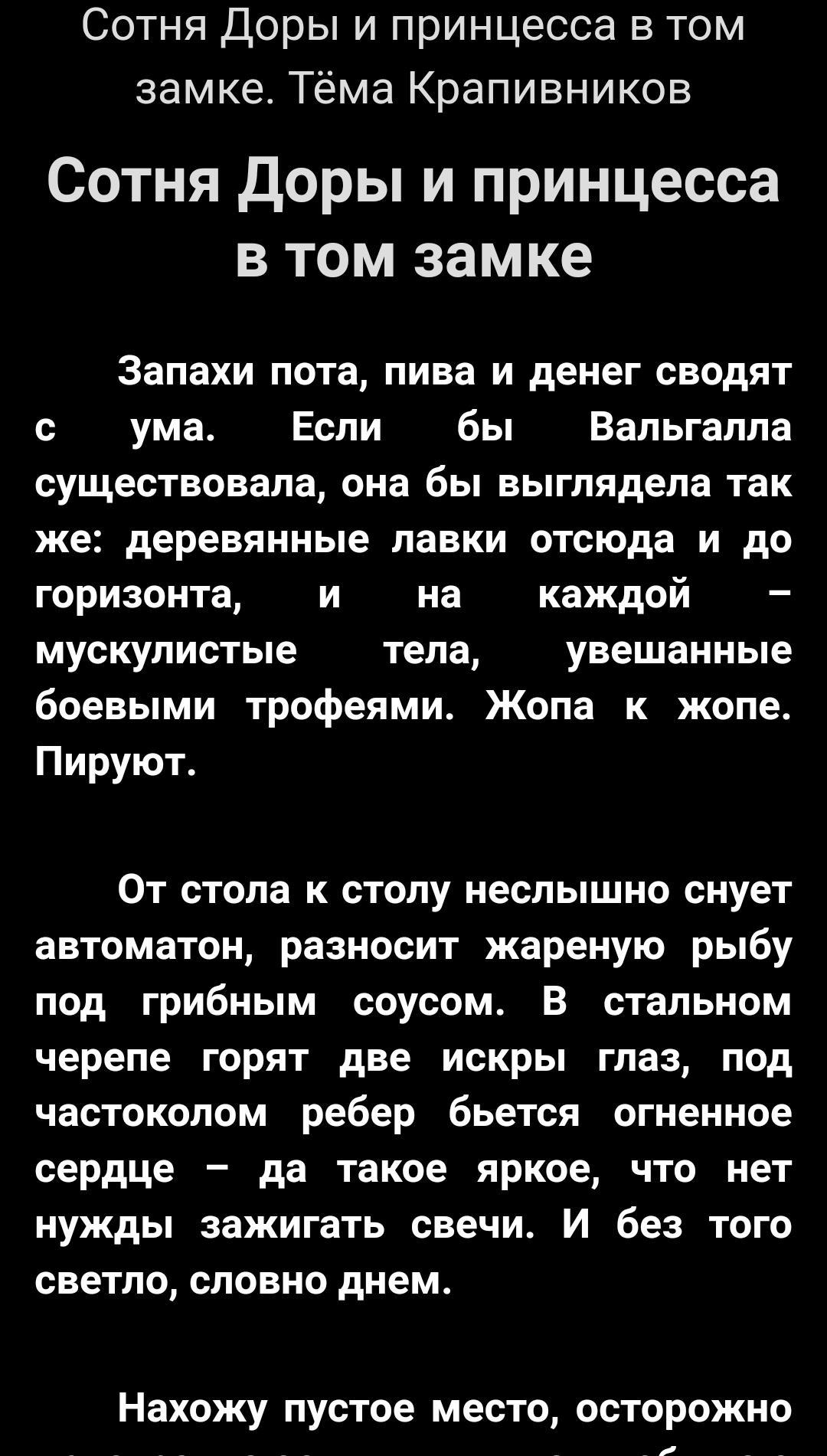 Так вот смею заявить вам, что мне хватило пяти минут, чтобы понять, что я читаю не дарк фентези, а третьесортную порнушку в сеттинге дарк фентези. Но вы не переживайте. Вы не самая худшая на этом конкурсе. Я, помимо оцениваемых работ, с огромным удовольствием прочитал ещё три десятка других конкурсных рассказов и даже нашёл парочку хуже ваших. Так что у вас есть повод для гордости.