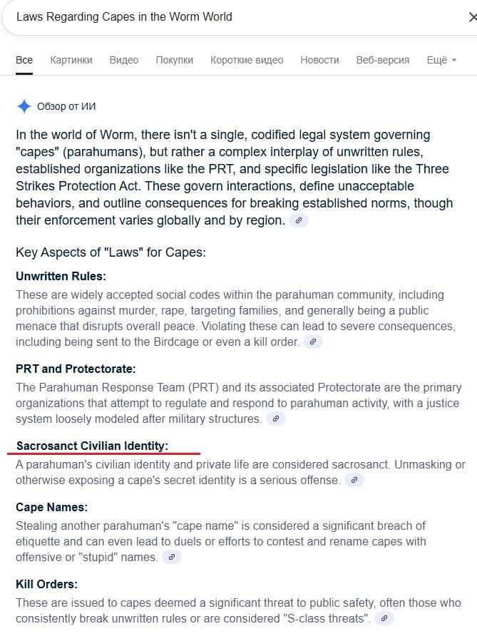Это не отменяет того факта что раскрытие личности кейпа является не только общественно порицаемым даже со стороны поехавших злодеев но и законодательно подсудным делом в мире червя.