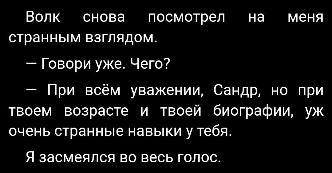 Немного отвлекали скобки, по мне так лучше было или с матом (раз рейтинг ставите 25+) или вообще без завуалированного мата.