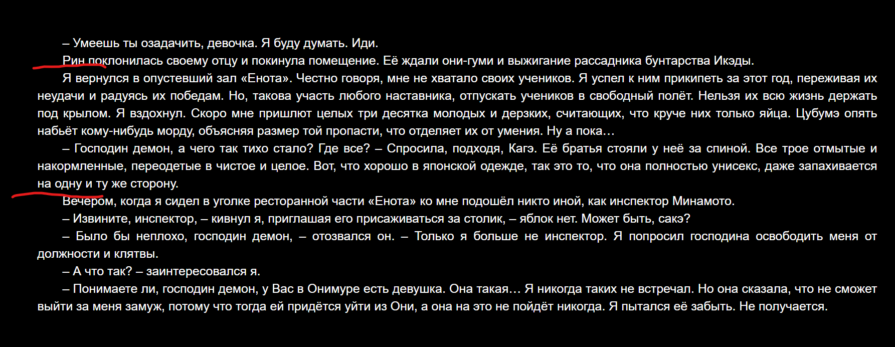 В одной из глав непонятно разделены события между ловлей воровки и её братцев, заселением учеников на Еноте и наказанием нового оябуна. Это наверное спойлер, на всякий спрячу.