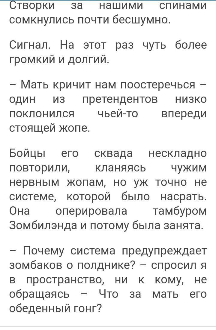 — Поднялись на пятый этаж второго корпуса. Оказались в тупике. Либо прыгать… либо биться… зомби за нами пришло столько, что они не помещались в коридоре! Лезли по головам! Сильные! Когтистые! Голодные! Мы забились в кладовке, забаррикадировались, но они выцарапали нас оттуда! Выковыряли как кровавую соплю из носа! Как мясо улитки из панциря! Вытянули и сожрали! А я… мы успели расширить вентиляцию. Меня пропихнули, засыпали кирпичом… я лежала и слышала, как жрут моих друзей! Сука! Я мечтала стать героем! Героем! Мы мечтали!