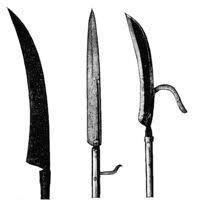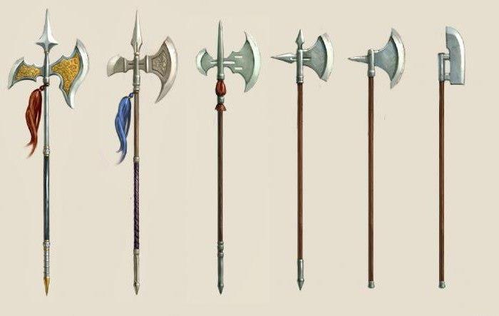 "Алеба́рда  — древковое холодное оружие с комбинированным наконечником, состоящим из игольчатого (круглого или гранёного) копейного острия и клинка боевого топора с острым обухом."