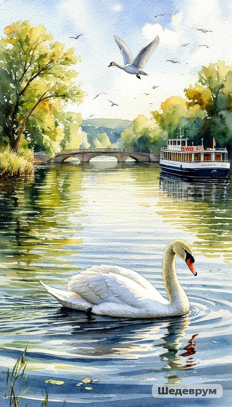 Про параход: вариантов масса! Разведут. Или вон там за кормой серенькое - створки шлюза и обводного канала. Или сбоку из протоки вырулил,выплыл в смысле. Или это крайний судоходный участок, теперь только вверх, а пристанька с боку в кадр не вошла. Или он тупо туристический, плавает тут по кругу, а публика на лебедей и красоты любуется