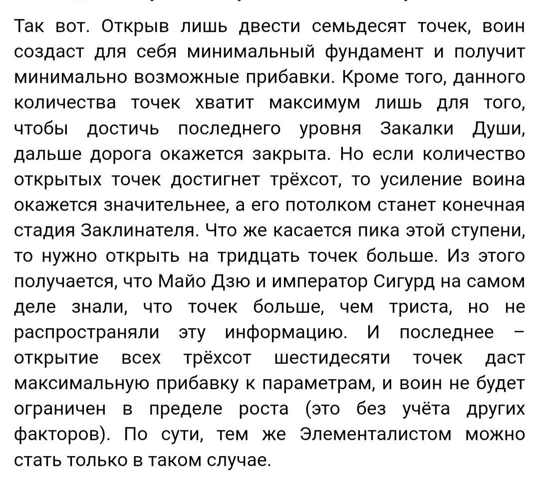Так как в личных сообщения нельзя закреплять скрины, то пишу сюда. Прочитал справку как Вы и посоветовали. Да вы все правильно сказали на счёт скрытых акупунктурных точек и в ходе прорыва на ступень Заклинателя и Элементалист они могут сами раскрыться. Но в данной книге есть абзац который противоречит сказанному в справки и в дальнейших книгах. ( Глава 1 почти в конце данный абзац)