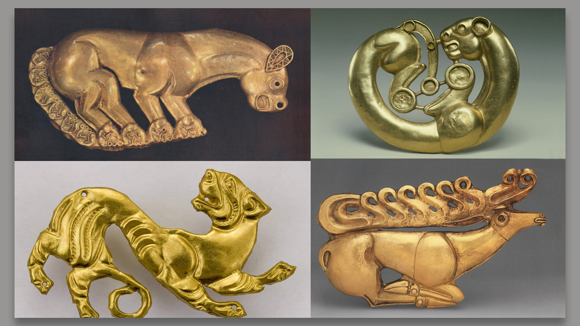 Я не привожу прорисовки бронзовых изделий и не даю отсылок на войлоки и татуировки Пазырыка, на коми-пермяцкие древности... Но сразу видно, что пектораль (хотя это - вершина ювелирного искусства своего времени) - это уже израстание, это уже античность в скифском гриме)))