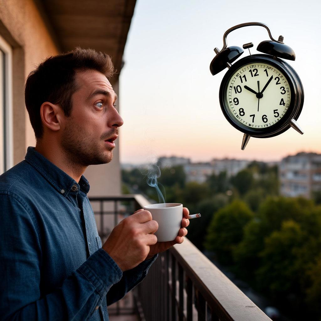 запрос: 7 утра. на балконе с чашкой кофе стоит человек и с удивлением смотрит на пролетающий мимо орущий будильник.