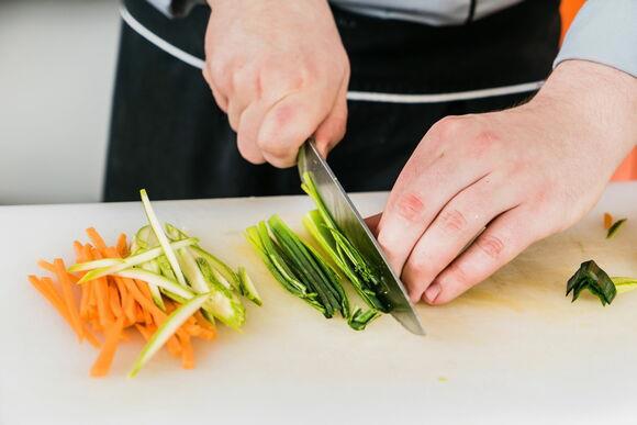 Стебли лука, порезаные поперек, превратились в длинную соломку... Кубики мяса 2 см диаметром...